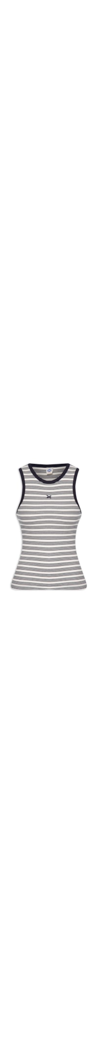 A regata azul é confeccionada em malha de algodão canelada com alta elasticidade. A peça solta ao corpo possui decote arredondado, alças médias, cavas regulares, logo da marca bordado na altura do busto, padronagem listrada em cores contrastantes e acabamento no decote e nas alças em cor contrastante.