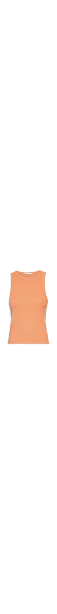 A regata laranja é confeccionada em malha de algodão com superfície canelada e alta elasticidade. A peça justa ao corpo possui decote redondo frontal e posterior nadador, cavas estendidas e leve transparência.
