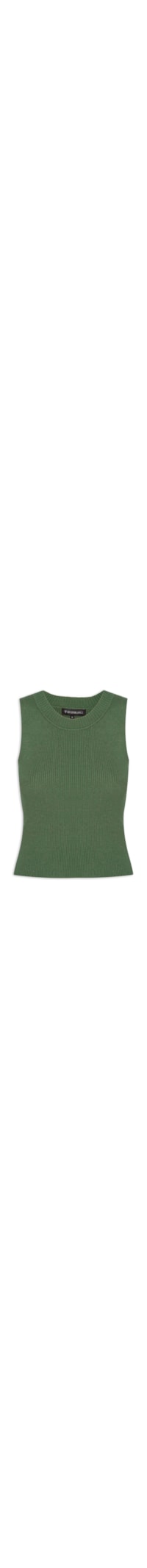 A regata verde é confeccionada em tricot com superfície canelada e sem elasticidade. A peça justa ao corpo possui decote redondo, alças médias, cavas estendidas, tag metálica da marca aplicada na parte posterior e acabamento em corte a fio.