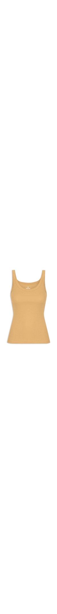 A regata bege é confeccionada em malha leve com superfície canelada sem elasticidade A peça justa ao corpo possui decote frontal e posterior em U, alças médias e cavas regulares.
