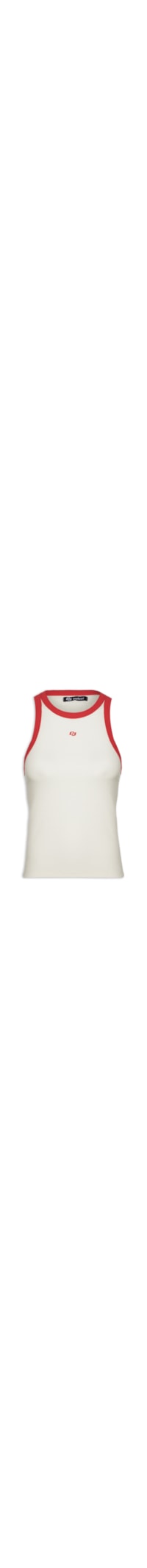 A regata vermelha é confeccionada em malha de algodão canelada com alta elasticidade. A peça justa ao corpo possui decote redondo, alças médias, cavas regulares, decote e cavas em cor contrastante, sem bojo e logo da marca bordado na altura do busto.