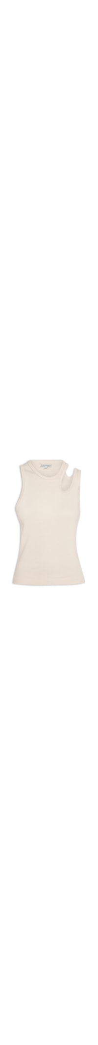 A regata bege é confeccionada em malha leve com superfície canelada de média elasticidade. A peça justa ao corpo, possui decote redondo, alças médias, recorte vazado no ombro, cavas estendidas e tag metalizada da marca aplicada na parte posterior do decote.