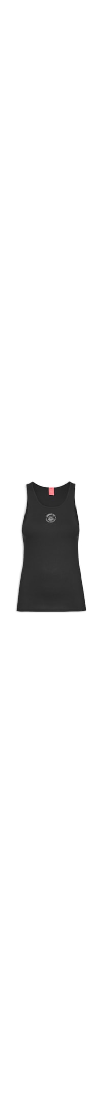 A regata preta é confeccionada em malha com superfície canelada e alta elasticidade. A peça justa ao corpo possui decote redondo, alças médias, cavas estendidas e tag da marca com estampa figurativa bordada na parte frontal em cor contrastante.