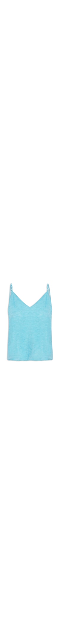 A regata azul é confeccionada em tecido leve com toque de linho com baixa elasticidade. A peça solta ao corpo possui decote V, alças finas, aviamento em miçangas nas alças, pences laterais, fechamento por amarração na parte posterior.