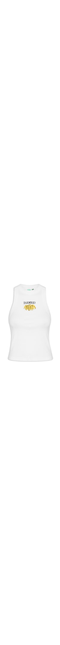 A regata branca é confeccionada em malha de algodão canelada com média elasticidade. A peça justa ao corpo possui decote nadador, alças médias, cavas regulares, estampa figurativa de banana em cores contrastantes, nome da marca bordado na parte frontal e comprimento cropped*.