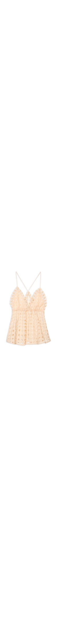 A regata bege é confeccionada em laise sem elasticidade. A peça solta ao corpo possui decote V profundo, alças finas, forro e recorte na altura do busto e leve transparência.