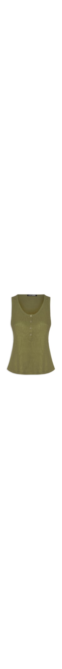 A regata verde é confeccionada em malha leve com superfície canelada sem elasticidade. A peça solta ao corpo possui decote U, alças médias, cavas estendidas, tag da marca na parte posterior e fechamento frontal por botões no decote.