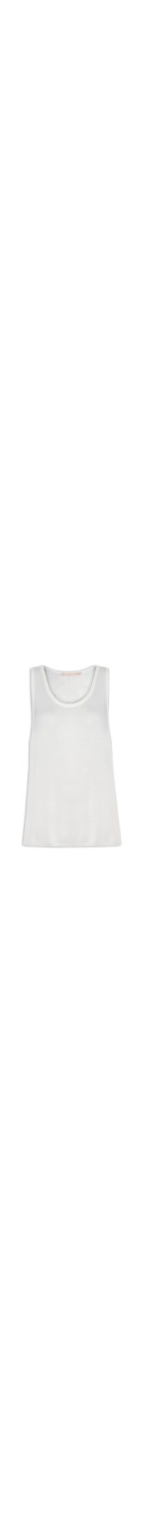 A regata branca é confeccionada em tricot leve com alta elasticidade. A peça solta ao corpo possui decote U, alças médias, cavas regulares, leve transparência e acabamento canelado.