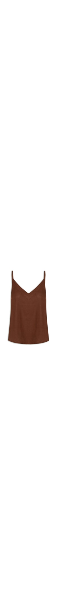 A regata marrom é confeccionada em tecido leve com toque de linho sem elasticidade. A peça solta ao corpo, possui decote em V, alças finas com regulagem, recortes na parte frontal do decote, tag metalizada da marca aplicada na parte posterior e barra arredondada.