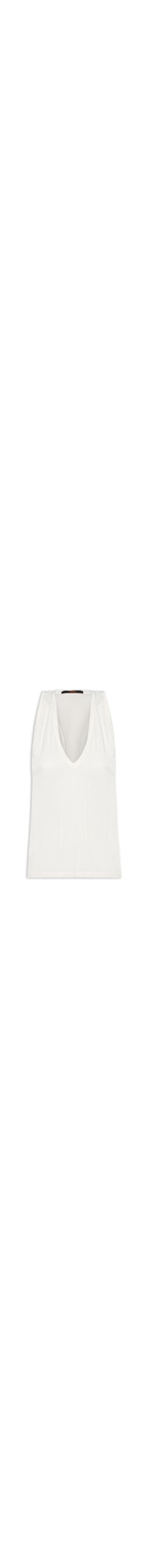 A regata off white é confeccionada em malha com média elasticidade. A peça solta ao corpo possui decote V profundo frontal e nadador posterior, cavas estendidas, alças médias e transparência.