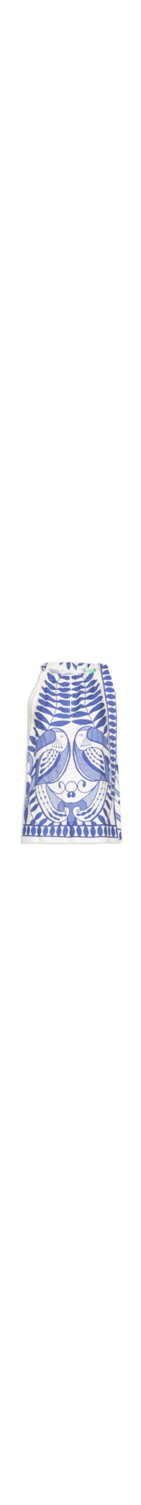 A regata azul é confeccionada em tecido leve sem elasticidade. A peça solta ao corpo possui decote trapézio, alças médias com cordão embutido alongado para amarração, cavas estendidas, recorte frontal e posterior vazado e mix de estampa em tom contrastante.