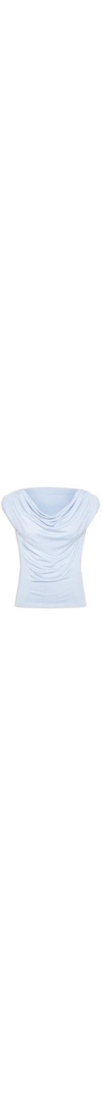 A regata azul é confeccionada em tecido leve com baixa elasticidade. A peça solta ao corpo possui decote degagê, alças largas, cavas regulares e efeito drapeado na parte frontal.