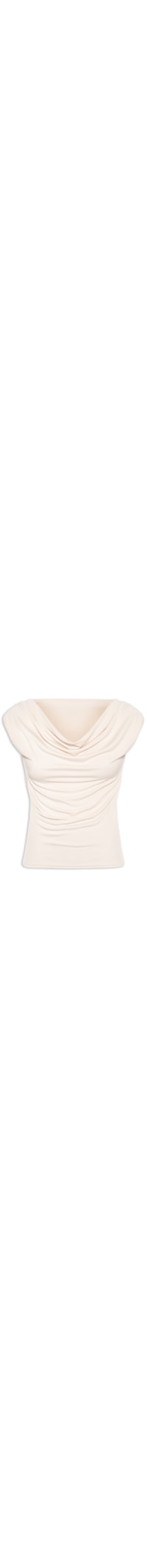 A regata bege é confeccionada em tecido leve com baixa elasticidade. A peça solta ao corpo possui decote degagê, alças largas, cavas regulares e efeito drapeado na parte frontal.