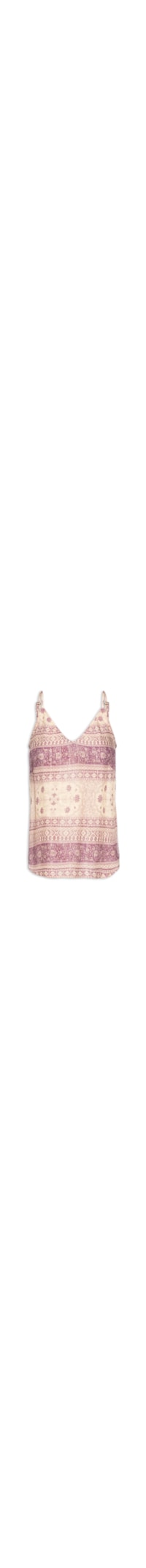A regata roxa é confeccionada em tecido leve com fios de lurex sem elasticidade. A peça solta ao corpo possui decote V, alças finas com regulagem na parte posterior, cavas regulares, pequenas fendas laterais e mix de estampas na cor bege.