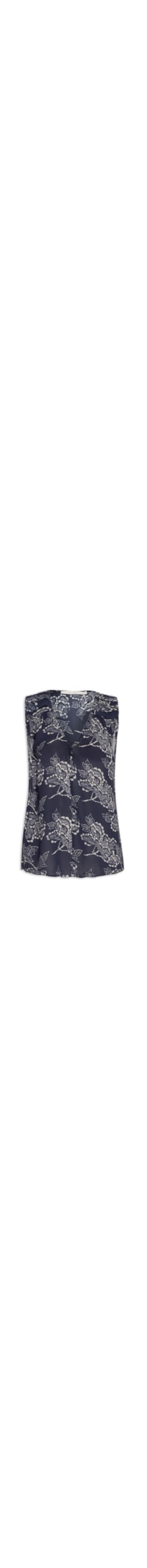 A regata azul é confeccionada em tecido leve sem elasticidade. A peça solta ao corpo possui decote V, alças largas com detalhs de franzidos, cavas estendidas, mix de estampas em cores contrastantes e barra mullet*.