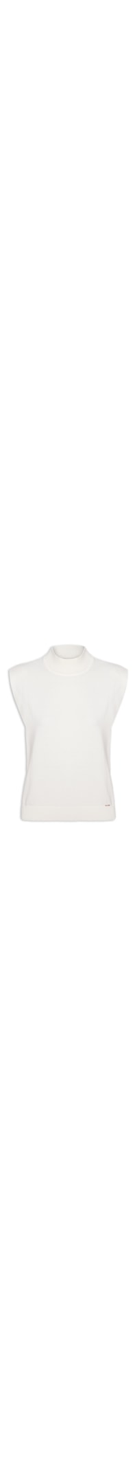 A regata branca é confeccionada em malha com média elasticidade. A peça justa ao corpo possui gola alta estilo chaminé, cavas amplas com ombros levemente estruturados, caimento ajustado ao tórax, barra com acabamento canelado e aplicação de tag metálica da marca na parte frontal.