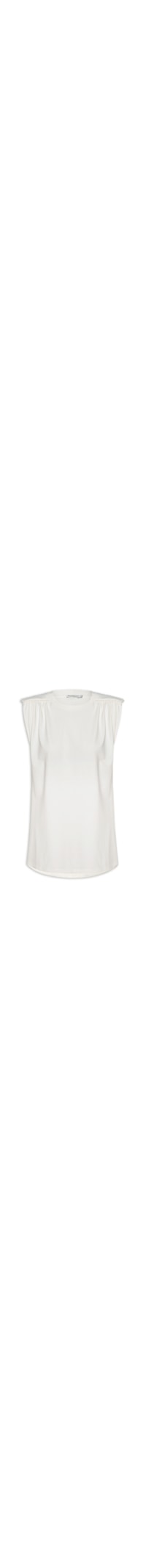 A regata branca é confeccionada em malha de algodão com baixa elasticidade. A peça solta ao corpo possui decote redondo com acabamento canelado, alças largas, ombreiras aplicadas com detalhe em vivo e efeito franzido, tag da marca aplicada em metal na parte posterior.