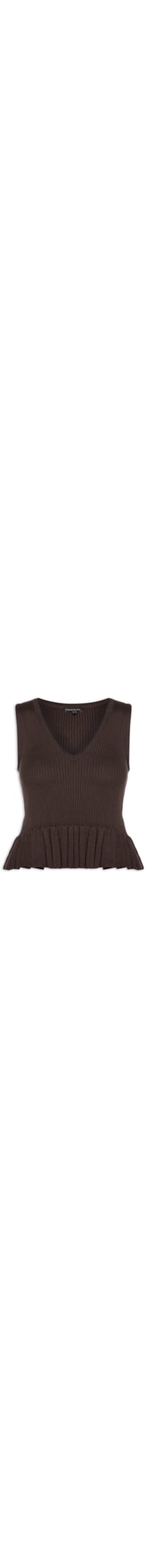 A regata marrom é confeccionada em tricô com baixa elasticidade. A peça solta ao corpo possui decote em V, alças médias, cavas regulares, trama canelada, recorte na altura da cintura com aplicação de babados, barra assimétrica e comprimento cropped*.