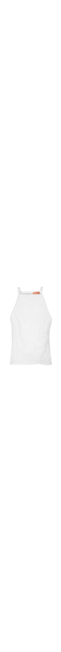 A regata off white é confeccionada em laise sem elasticidade. A peça solta ao corpo possui decote reto, alças finas, cavas estendidas, recorte posterior vazado com botão aplicado e pences na altura do busto.