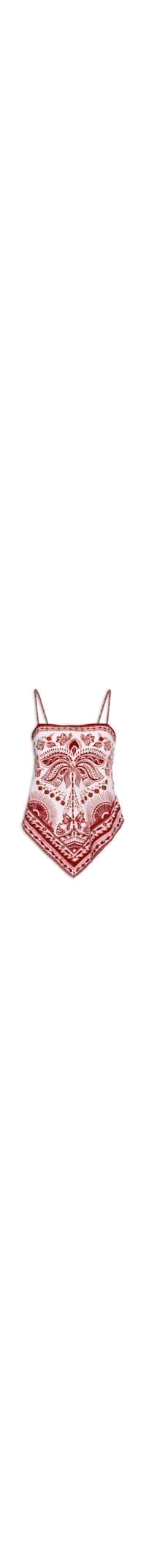 A regata vermelha é confeccionada em tecido leve sem elasticidade. A peça solta ao corpo, possui decote reto, alças finas com regulagem, elástico embutido na parte posterior do decote, mix de estampas em cor contrastantes, barra assimétrica frontal e posterior e forro curto.