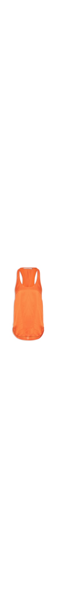 A regata laranja é confeccionada em tecido leve com superfície acetinada. A peça possui decote frontal U e posterior nadador, alças finas, cavas estendidas, pences na altura do busto, barra mullet* arredondada, comprimento alongado, shape solto, caimento reto e acabamento pespontado.