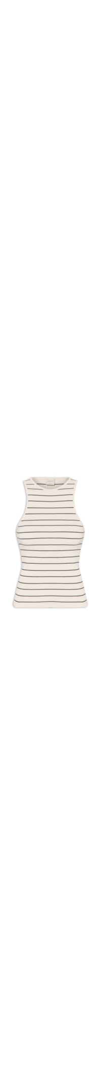 A regata off white é confeccionada em malha leve com superfície canelada de média elasticidade. A peça justa ao corpo, possui decote redondo com posterior nadador, cavas estendidas, padronagem listrada em cor contrastante e acabamento canelado.