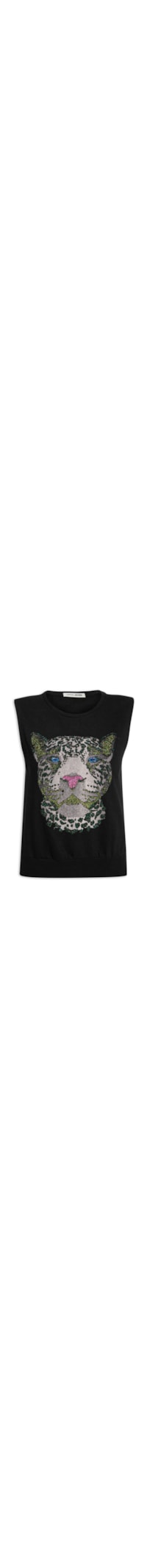 A regata preta é confeccionada em malha de algodão de baixa elasticidade. A peça solta ao corpo, possui decote redondo com acabamento canelado, alças largas, estampa de onça em silk de cores contrastantes com brilho em relevo aplicado, logo da marca brilhoso estampado na parte posterior do decote, recorte posterior e barra com acabamento canelado.