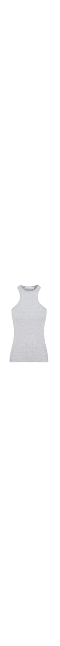 A regata cinza é confeccionada em malha de algodão com superfície canelada e alta elasticidade. A peça possui decote frontal redondo e posterior nadador e cavas estendidas.