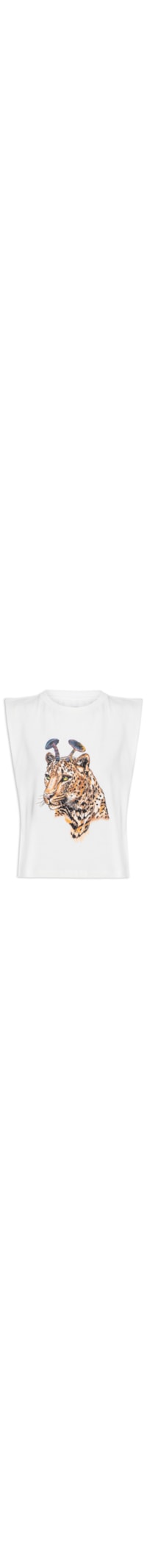 A regata branca é confeccionada por malha com média elasticidade. A peça solta ao corpo possui decote redondo com acabamento canelado, alças grossas, cavas levemente estendidas, estampa figurativa de onça em silk e glitter, pequenas fendas laterais e logo da marca aplicado na parte posterior.