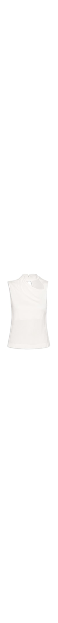 regata branca é confeccionada em malha de algodão com baixa elasticidade. A peça justa ao corpo possui gola alta com decote vazado assimétrico, decote posterior vazado, cavas estendidas, barra alongada e tag da marca aplicada na parte posterior.