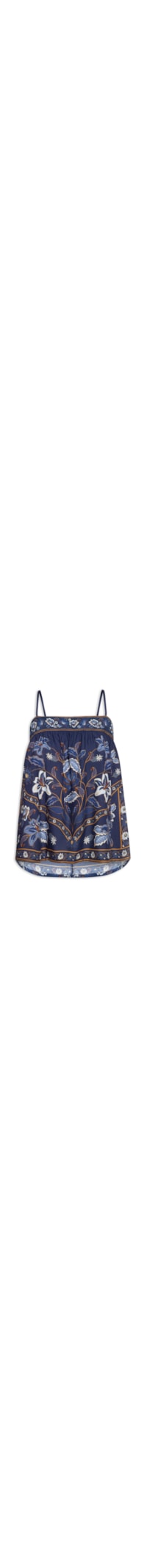 A regata azul é confeccionada em tecido leve sem elasticidade. A peça solta ao corpo possui decote reto, alças finas ajustáveis, estampa floral em cor contrastante, recorte posterior vazado com cordão aplicado para amarração e ponteiras em tassel.
