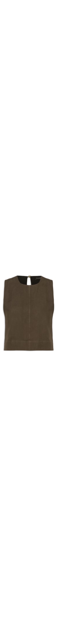 A regata marrom é confeccionada em linho sem elasticidade. A peça solta ao corpo possui decote redondo, alças grossas, cavas levemente estendidas, forro e recorte posterior vazado com fechamento por botão.