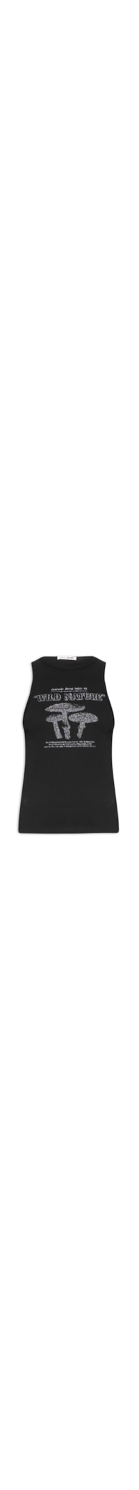 A regata preta é confeccionada em malha com superfície canelada de média elasticidade. A peça solta ao corpo, possui decote redondo, cavas estendidas, estampa figurativa de cogumelos e escrita em cor contrastante com relevo e brilho aplicado, logo da marca aplicado na parte posterior do decote e acabamento canelado.