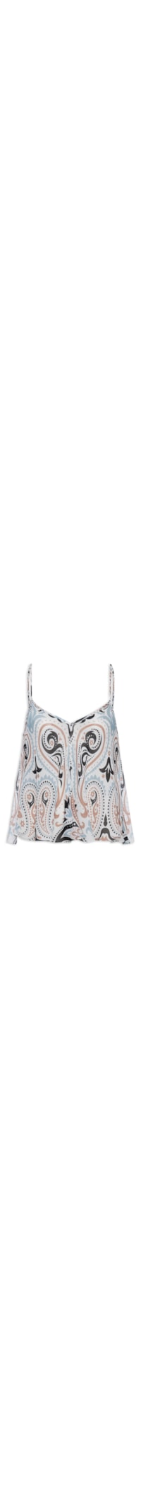 A regata azul é confeccionada em tecido leve. A peça solta ao corpo possui decote V, alças finas reguláveis, cavas regulares, decote posterior profundo em U e estampa figurativa em cores contrastantes.