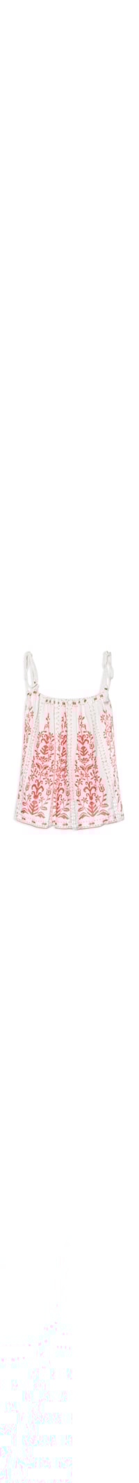A regata vermelha é confeccionada em tecido leve com superfície flocada sem elasticidade. A peça solta ao corpo possui decote U com detalhes de franzidos, alças estendidas para amarração em cordões torcidos com ponteiras em tassel, recortes frontais com aplicação de bordados, forro e estampa de bordado em ponto cruz.
