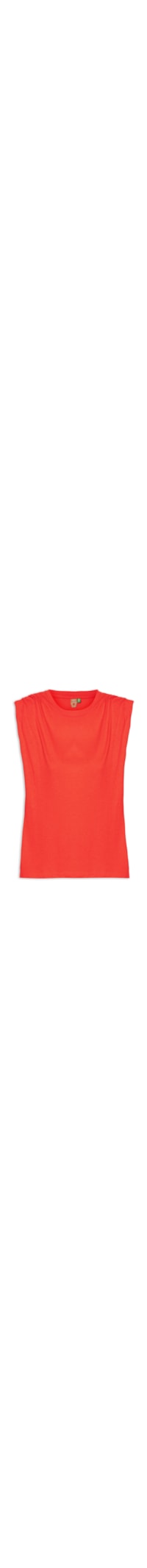 A regata vermelho é confeccionada por malha de algodão sem elasticidade. A peça solta ao corpo possui decote redondo com acabamento canelado, alças grossa com ombreiras embutidas e pregas aplicadas e cavas estendidas.