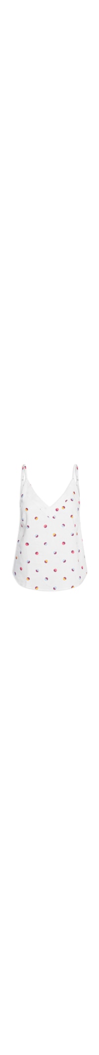 A regata branca é confeccionada em linho misto sem elasticidade. A peça solta ao corpo possui decote V frontal e posterior, alças finas e estampa poá em cores contrastantes.