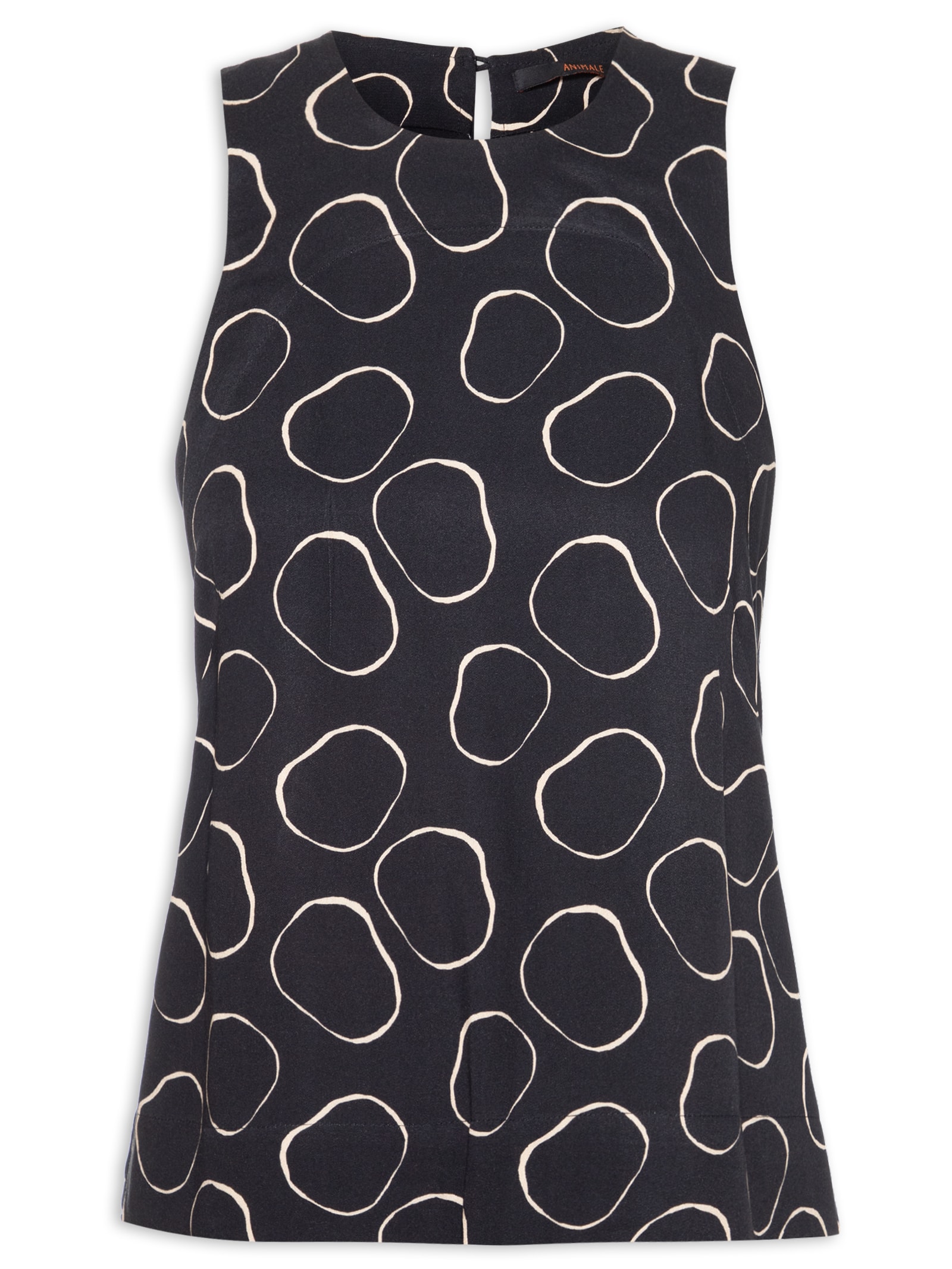 A regata preta é confeccionada em tecido leve sem elasticidade. A peça solta ao corpo possui decote redondo, alças largas, estampa figurativa de círculos na cor bege, fenda posterior e fechamento posterior por botões.