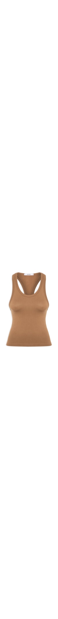 A regata marrom é confeccionada em malha canelada com média elasticidade. A peça justa ao corpo possui decote redondo, sem mangas, ombros médios, costas modelo nadador, acabamento canelado no decote e nas cavas e barra reta.