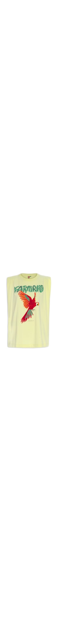 A regata verde é confeccionada em malha de algodão com baixa elasticiade. A peça solta ao corpo possui decote redondo canelado, ombros e cavas estendidos, estampa figurativa em silk e cores contrastantes na parte frontal e comprimento alongado.