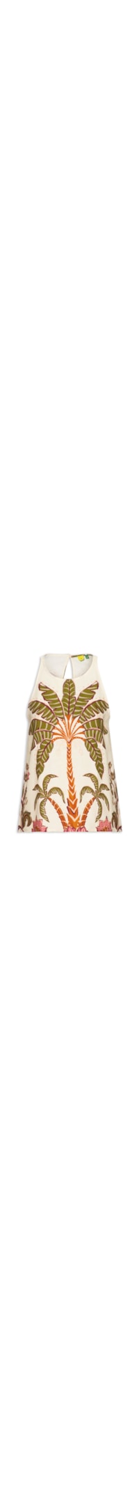 A regata verde é confeccionada em tecido leve sem elasticidade. A peça solta ao corpo possui decote redondo, alças finas, cavas estendidas, fendas laterais, recorte vazado posterior, estampa figurativa de coqueiros em cores contrastantes e fechamento posterior por botão.