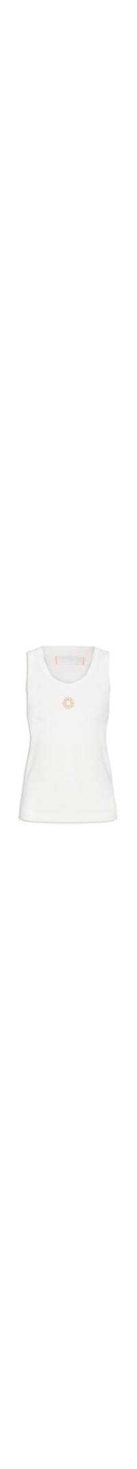 A regata branca é confeccionada em malha com superfície canelada e média elasticidade. A peça justa ao corpo possui decote U, alças médias, cavas estendidas, aplicação de bordado figurativo de sol na altura do busto em cor contrastante e com fios de lurex e tag metálica da marca aplicada na parte posterior.