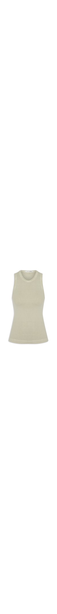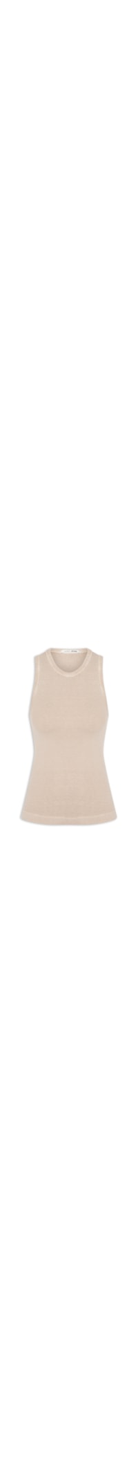 A regata bege é confeccionada em malha de algodão com média elasticidade. A peça justa ao corpo possui decote redondo, alças largas, tag metálica da marca aplicada na parte posterior e acabamento canelado com detalhe de puídos.
