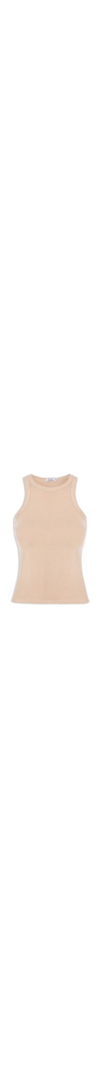 A regata bege é confeccionada em malha canelada com alta elasticidade. A peça justa ao corpo possui decote trapézio, alças médias e cavas estendidas.