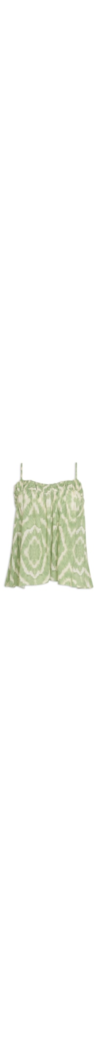 A regata verde é confeccionada em tecido leve sem elasticidade. A peça solta ao corpo possui decote em V, alças finas reguláveis, decote posterior profundo, recorte na altura do decote, barra com efeito de babado e padronagem tie dye em cor contrastante.