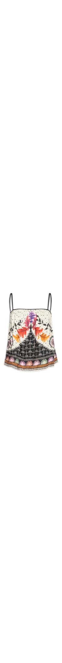 A regata preta é confeccionada em tecido leve sem elasticidade. A peça solta ao corpo possui decote reto, alças finas com regulagem, meio forro e mix de estampas em cores contrastantes.