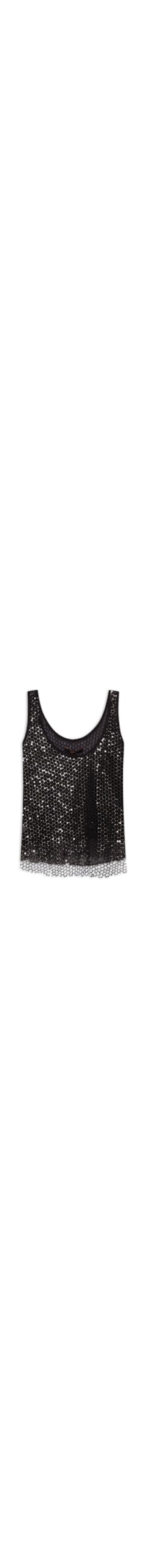 A regata preta é confeccionada em tela com superfície em paetês. A peça possui decote frontal e posterior em U, alças médias, cavas regulares, forro, barra arredondada e shape solto.