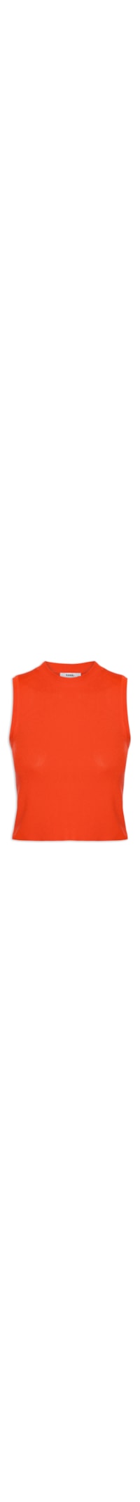 A regata laranja é confeccionada em tricot com alta elasticidade. A peça justa ao corpo possui decote arredondado, alças médias, cavas regulares, comprimento cropped* e superfície canelada.