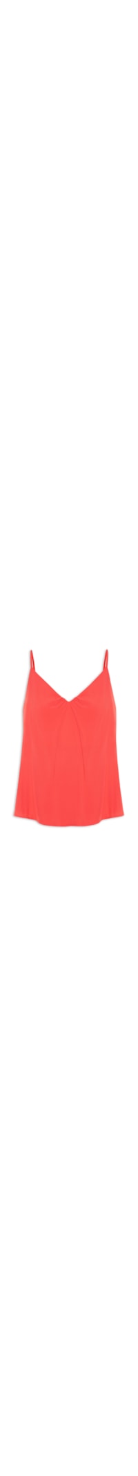 A regata vermelha é confeccionada em tecido leve. A peça possui decote frontal e posterior em V com detalhes de pregas, alças finas, meio forro na altura do busto e shape solto.