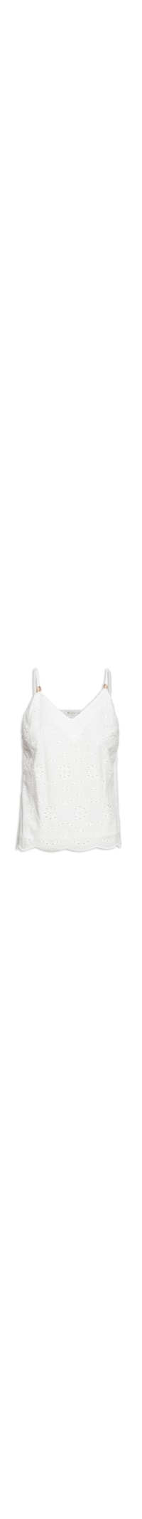 A regata branca é confeccionada em tecido laise leve sem elasticidade. A peça solta ao corpo possui decote em V, alças reguláveis com detalhe aplicado, barra com detalhes arredondados, leve transparência, comprimento médio, forro, sem fechamento.